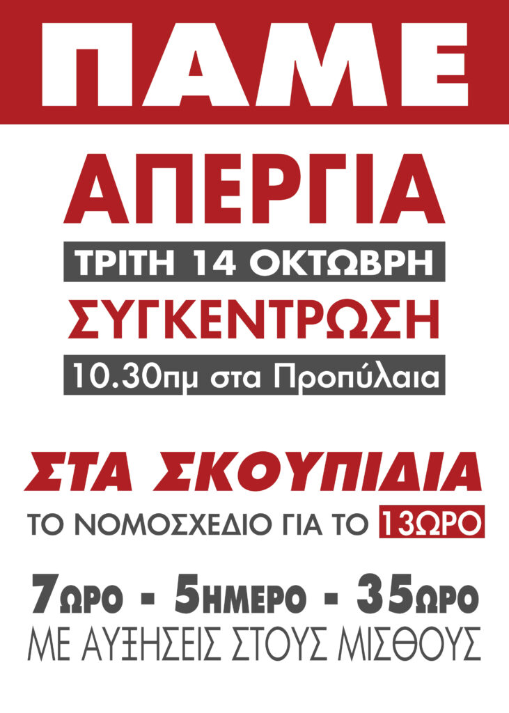 Τρίτη 14 Οκτώβρη, ημέρα πανελλαδικής πανεργατικής απεργίας! Το νομοσχέδιο της αποκτήνωσης απορρίπτεται! ΑΠΑΙΤΟΥΜΕ 7ΩΡΟ-5ΗΜΕΡΟ-35ΩΡΟ ΜΕ ΑΥΞΗΣΕΙΣ ΣΤΟΥΣ ΜΙΣΘΟΥΣ! Η Ομοσπονδία Φαρμάκου χαιρετίζει τους δεκάδες εργαζόμενους στον κλάδο που απέργησαν για πρώτη φορά στην απεργία της 1ης Οκτωβρίου. Παίρνουμε την σκυτάλη από τη μεγάλη απεργιακή κινητοποίηση της περασμένης Τετάρτης και τις δυνατότητες που ανέδειξαν η συμμετοχή […]