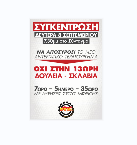 Η Ομοσπονδία Φαρμάκου καλεί τα κλαδικά και επιχειρησιακά σωματεία να οργανώσουν τον αγώνα ενάντια στο νέο αντεργατικό έκτρωμα που φέρνει η κυβέρνηση για το 13ωρο και τα ευέλικτα ωράρια. Συμμετέχουμε μαζικά και δυναμικά στη συγκέντρωση τη Δευτέρα 8 Σεπτεμβρίου 19:30 στο Σύνταγμα. Κλιμακώνουμε τη δράση μας με προετοιμασία πανεργατικής απεργίας! Όσες όμορφες φράσεις και αν […]