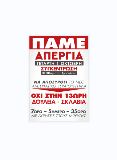 ΝΑ ΑΠΟΣΥΡΘΕΙ ΤΩΡΑ ΤΟ ΝΟΜΟΣΧΕΔΙΟ ΓΙΑ ΤΟ 13ΩΡΟ ΚΑΙ ΤΗΝ ΕΥΕΛΙΞΙΑ! ΑΠΑΙΤΟΥΜΕ 7ΩΡΟ-5ΗΜΕΡΟ-35ΩΡΟ ΜΕ ΑΥΞΗΣΕΙΣ ΣΤΟΥΣ ΜΙΣΘΟΥΣ Η Ομοσπονδία Φαρμάκου αποφάσισε τη συμμετοχή στην 24ωρη απεργία της 1ης Οκτωβρίου. Καλούμε τα κλαδικά και επιχειρησιακά σωματεία του κλάδου να πάρουν αγωνιστικές αποφάσεις συμμετοχής στην απεργία, να οργανώσουν περιοδείες, εξορμήσεις στις φαρμακοβιομηχανίες, τις φαρμακαποθήκες, ώστε να σημάνει […]