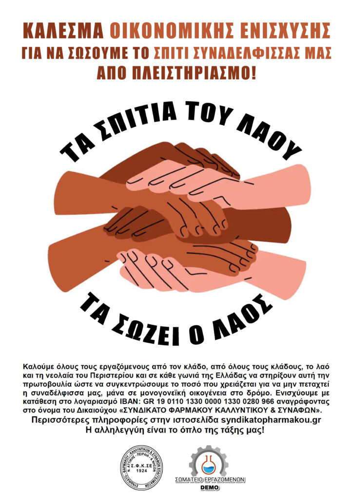 ΔΥΝΑΜΩΝΟΥΜΕ ΤΟΝ ΑΓΩΝΑ ΕΝΑΝΤΙΑ ΣΤΟ ΝΟΜΟΘΕΤΙΚΟ ΠΛΑΙΣΙΟ ΠΟΥ ΕΧΟΥΝ ΨΗΦΙΣΕΙ ΟΛΕΣ ΟΙ ΚΥΒΕΡΝΗΣΕΙΣ ΓΙΑ ΤΟΥΣ ΠΛΕΙΣΤΗΡΙΑΣΜΟΥΣ ΚΑΙ ΤΗΝ ΑΡΠΑΓΗ ΤΩΝ ΣΠΙΤΙΩΝ ΜΑΣ ΕΝΙΣΧΥΟΥΜΕ ΤΗΝ ΠΡΩΤΟΒΟΥΛΙΑ ΤΟΥ ΣΥΝΔΙΚΑΤΟΥ ΜΑΣ ΚΑΙ ΤΟΥ ΣΩΜΑΤΕΙΟΥ ΕΡΓΑΖΟΜΕΝΩΝ DEMO ΚΑΙ ΣΥΓΚΕΝΤΡΩΝΟΥΜΕ ΑΜΕΣΑ ΧΡΗΜΑΤΑ ΓΙΑ ΝΑ ΣΩΣΟΥΜΕ ΤΟ ΣΠΙΤΙ ΤΗΣ ΣΥΝΑΔΕΛΦΙΣΣΑΣ ΜΑΣ ΚΑΤΑΘΕΤΟΝΤΑΣ ΧΡΗΜΑΤΑ ΣΤΟΝ ΛΟΓΑΡΙΑΣΜΟ ΤΟΥ ΣΥΝΔΙΚΑΤΟΥ ΦΑΡΜΑΚΟΥ ΣΤΗΝ ΕΘΝΙΚΗ ΤΡΑΠΕΖΑ […]